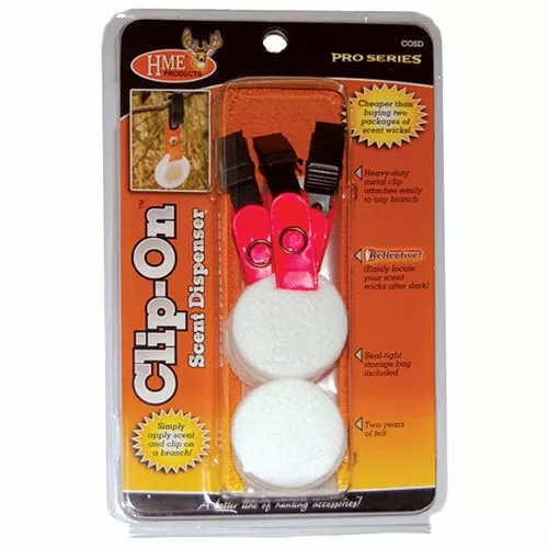 HME? Clip-On? Scent Dispensers is one of the easiest-to-use scent dispensers available. They are made of a highly-reflective vinyl material and have a heavy-duty metal clip on one end and a snap loop on the other. The metal clip easily attaches to any small branch. The snap loop allows the hunter to change scents by unclipping the loop and changing felts. The reflective band allows the hunter to easily locate their scent dispensers when leaving the woods.