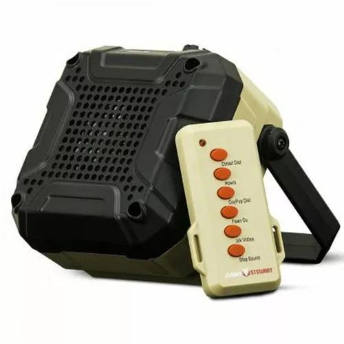 Johnny Stewarts Calls Grim Speaker GS1 Predator Call is lightweight and powerful. It is packed with five preprogrammed, authentic Johnny Stewart® predator calls in 16-bit clarity. Each call loops for 30 seconds to keep the action rolling. The handheld remote nests in the back of the caller and has a range of 50 yards. It is loud, compact and ready to get in the field. The five pre-loaded sounds are desperate cries of cottontail, crywolf bark/howls, coyote pup distress, fawn bleating and vittles a'la jackrabbit.