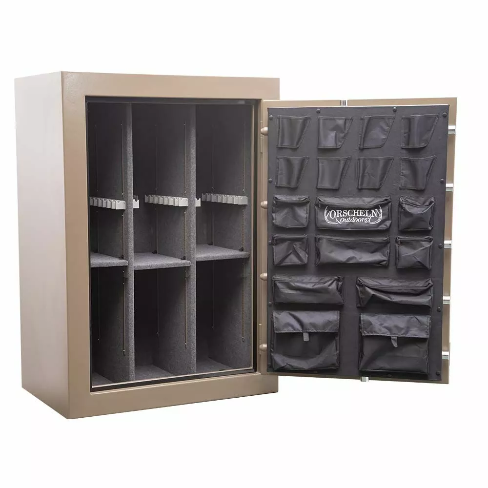 Orscheln Outdoors™ 56 Gun Safe is a fully carpeted lined interior gun safe with 8 adjustable shelves, 48 adjustable barrel rests and 14 scope rests. The door features 8 holsters for handguns, 8 medium storage pockets and 2 large storage pockets. It is 4 way locking with 7, 1-1/2 in. live action bolts and 4, 1-1/2 in. stationary bolts. This safe can be used with First Watch®. It can be quickly and easily set up with your safe, allowing you to customize the security and manage the device access. It also easily turns enhanced features on and off . First Watch® works with smartphones, user pin, keypad and e-key. There is a built in door sensor and ability for dual authentication using facial recognition, finger prints, pin code or pattern. First Watch® is available at the App Store and Google Play. Additional features include: Vacation mode (completely disable the access of your safe), Child Protect mode (Adds a layer of safety and security), 2-Step Authentication (requires 2 different unlock methods), and Spy Protection mods (allows the use of 2 random digits).