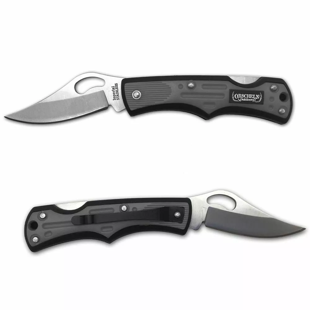 Orscheln Outdoors™ 2.5 in. clip point blade pocket knife with a satin finish and a ergonomic plastic handle.