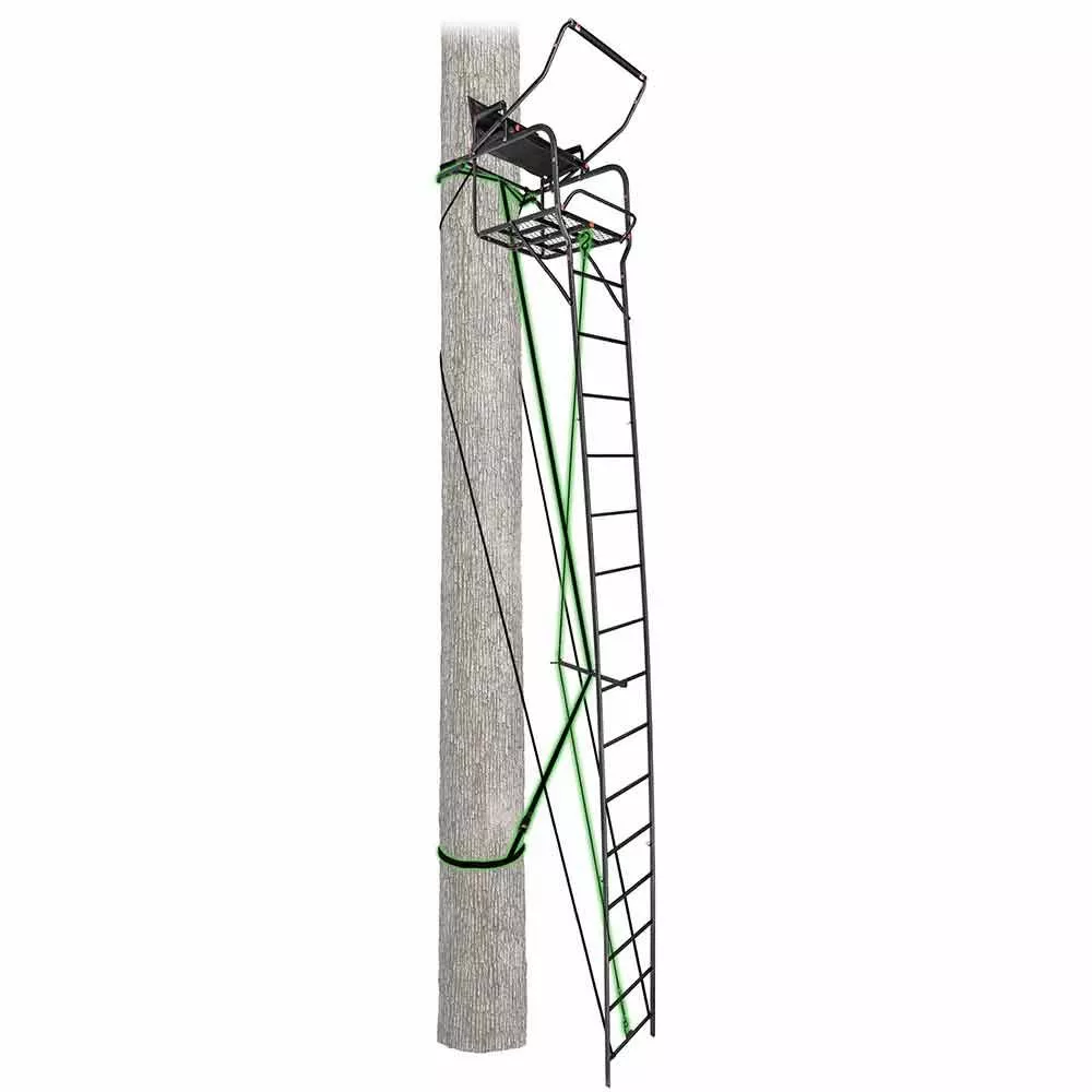 The Primal 22 ft. Mac Daddy Deluxe Xtra Wide Ladderstand is a single person treestand that features our Patented Grip Jaw and Stabilizer Truss System for enhanced ladder strength and stability. Our 24 in. extra wide textaline seat is made of soft molded foam for all day comfort, and at 22 ft. in the air, you'll be able to see anything coming from miles away. It has a 24 x 29 in. foot platform and 20 in. ladders with rounded rectangular tubing for a sure grip as well as padded arm rests and an adjustable shooting rail. It also has a full body safety harness included.
