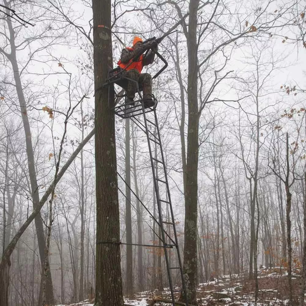 The Rivers Edge® Retreat™ ladder stand features a flip-up, TearTuff™ mesh seat paired with a 26 inch deep foot platform and flip-out footrest providing plenty of room for leg stretching or space to stand and shoot. The Retreat™ ladder stand has a 2-way adjustable shooting rail allowing you to set a height and depth that works for you. Make the Retreat™ ladder stand your top choice for your next hunt.