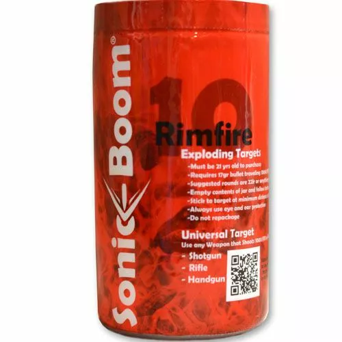 Sonic Boom Rimfire Exploding Rifle Target is designed for use with .22lr – handguns – shotguns. Requires a min. 17gr. Bullet traveling 1000 fps or faster, suggested rounds are 22 lr or larger. Empty contents of jar and follow instructions, stick to target at a minimum distance of 25 yds., always use eye & ear protection, do not repackage. Must be 21 years or older to purchase.