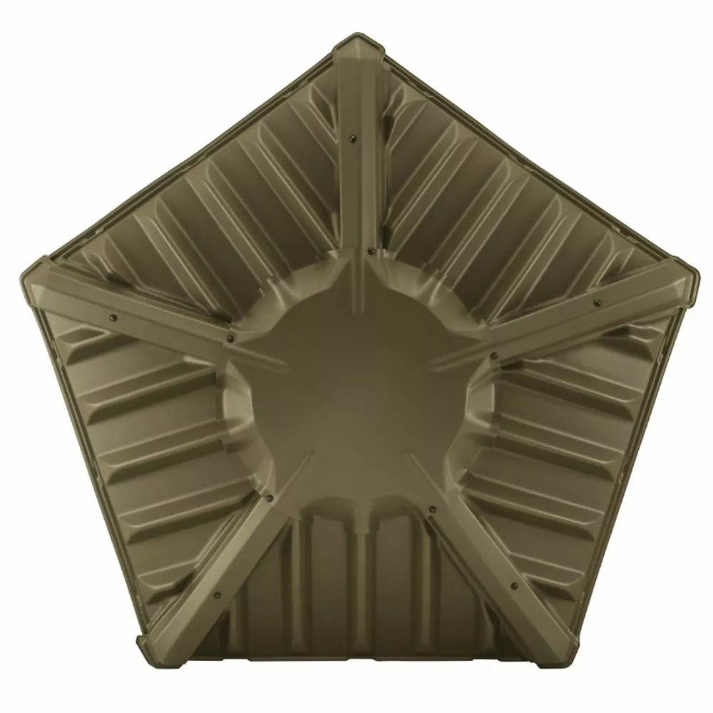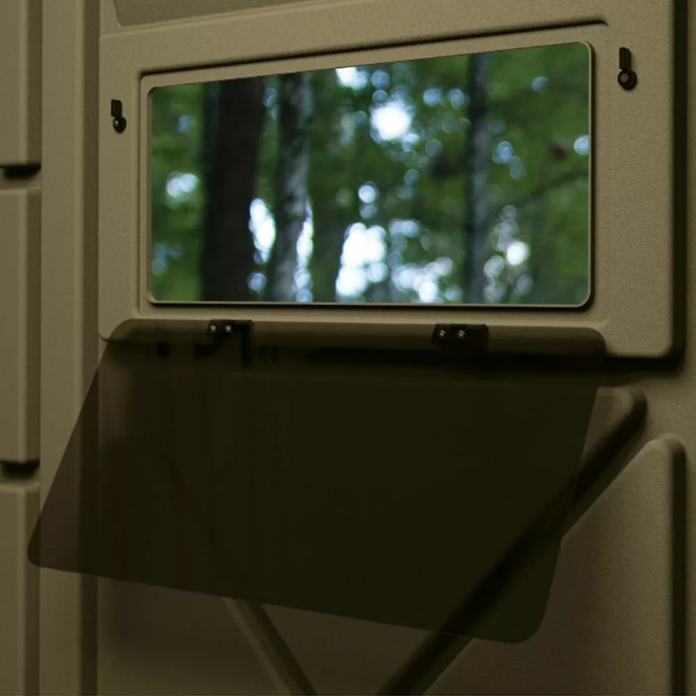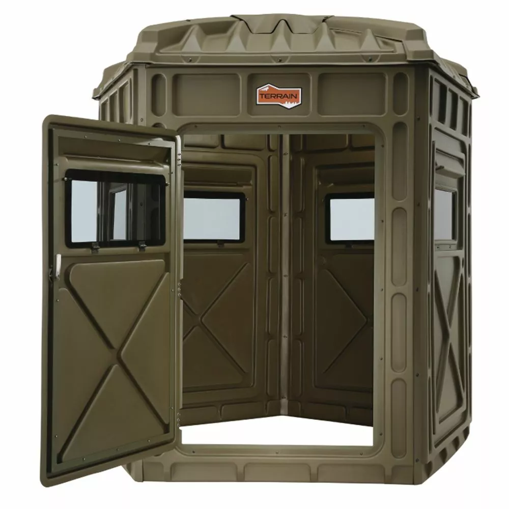 Terrain The Range 5-Sided Hunting Blind provides superior 360° visibility. The window awnings protect against rain and snow. The spacious interior fits two hunters and their gear. It is fast and easy to set-up and can be transported by pickup truck or assembled onsite. Pre-drilled holes help make assembly easy (hardware included). The overlapping walls protects from the elements and the latch keeps the door secure. The tinted Plexiglass window provide concealment. There are easy access windows at shooting levels and a heavy duty door frame for stability.