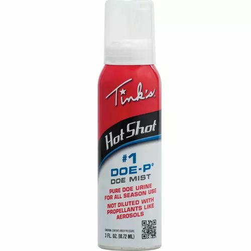 Tink's Hot Shot #1 Doe-P Non-Estrous Mist is 100% natural doe urine collected from live whitetail does. An internal bag separates the urine from the pressurizing agent so there is no contamination. The system allows the entire product to be dispensed. Sprays at any angle, even upside down.