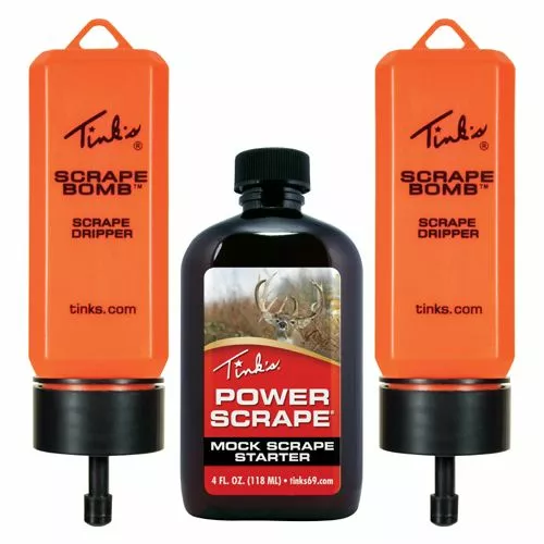 Tink?s Power Scrape with 2 Scrape Bombs is a powerful synthetic buck lure designed for the entire season. Power Scrape can be used on natural or mock scrapes to condition deer to frequently return to your stand location. This revolutionary formula is designed to capitalize on a buck?s curiosity in the early season and their drive for territorial dominance during the breeding season. It can be used on natural or mock scrapes and conditions bucks to revisit scrapes. Scrape Bomb works with the changes in temperature and barometric pressure causing it to drip only during the daylight hours.